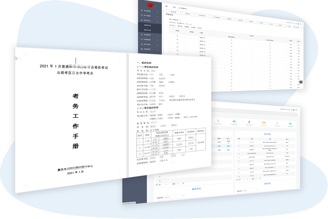 為解決考試中心考場(chǎng)安排和管理難題而推出的考試安排管理系統(tǒng)。幫助考試中心解決監(jiān)考老師無(wú)考前培訓(xùn)記錄、無(wú)合規(guī)性考試記錄、手動(dòng)編排考場(chǎng)安排難、考后數(shù)據(jù)統(tǒng)計(jì)困難的問(wèn)題。從監(jiān)考老師在線(xiàn)學(xué)習(xí)培訓(xùn)、合規(guī)性考試、考場(chǎng)安排、秩序冊(cè)生成到監(jiān)考記錄導(dǎo)出的全流程功能覆蓋,一站式解決大部分問(wèn)題。